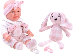 Muñeca encantadora: un bebé en un conjunto rosa y blanco con un suave conejito de peluche y dos chupetes que hará feliz a cualquier pequeña mamá. La muñeca tiene rasgos realistas, ropita suave para cambiar y accesorios agradables para un juego creativo. Un regalo ideal para desarrollar la imaginación y las habilidades de cuidado. Materiales suaves, diseño adorable y detalles seguros para niños.