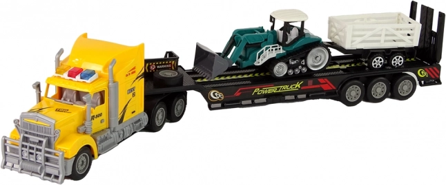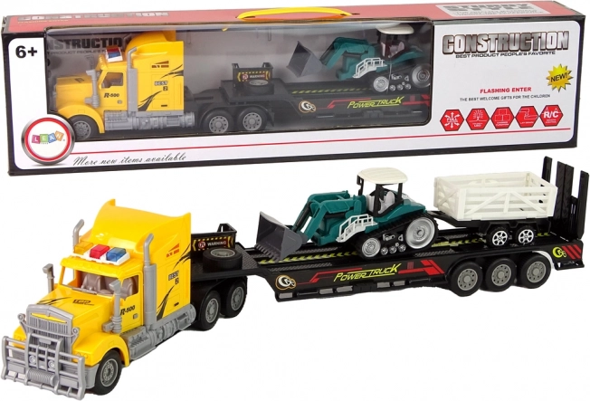 El remolque de plataforma baja y el remolque desmontable permiten transportar con seguridad maquinaria y carga. Perfecto para simular el transporte real en la obra.
