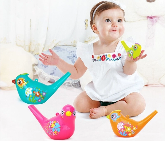 Este silbato de plástico con forma de pájaro está diseñado para el juego tanto en casa como al aire libre y en el baño. Basta soplar para que suene fuerte y claro. Al verter agua por el orificio de la cabeza, el silbato gorjea y cambia la altura del tono según la cantidad de agua y la fuerza del soplido.