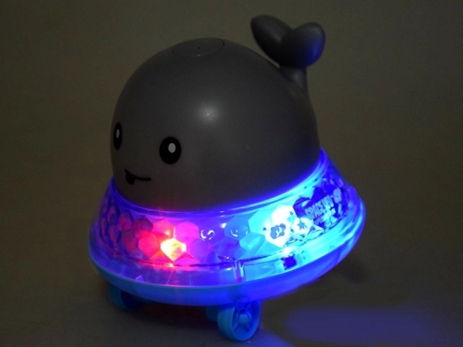 Fuera del agua, coloque la ballena sobre la plataforma, cambie el interruptor on/off y observe cómo se desplaza al ritmo de música alegre con efectos de luz.