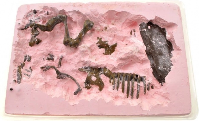 - Bloque de yeso para excavación, pincel, cincel, martillo con rascador, piezas del esqueleto, base
