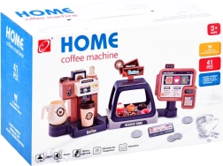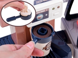 El diseño modular permite unir la cafetera, la caja y la vitrina o usarlas por separado. Los abundantes accesorios (vasos para café con tapas, portafiltro, tamper, jarrita para leche, dulces, bocadillo, panecillo, monedas y billetes, tarjeta) fomentan el juego de tienda realista y desarrollan la creatividad y la colaboración con los compañeros.