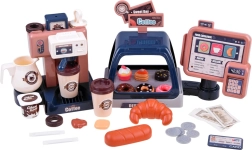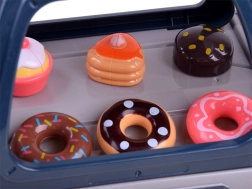 Este set realista permite a los niños abrir su propia cafetería: preparan un “espresso”, exponen los dulces en la vitrina y registran el pedido en la caja. La cafetera con flujo de agua, tras verter agua por arriba e insertar el portafiltro, “prepara” café con señalización luminosa (rojo durante la preparación, verde al terminar) y sonidos de molido y vertido. La caja registradora tiene panel giratorio, emite un pitido al pagar con tarjeta y suena al abrirse.
