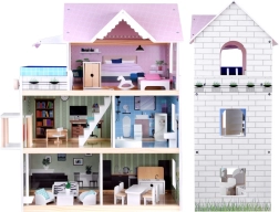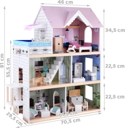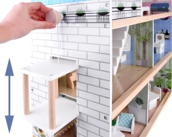 Esta hermosa casita de muñecas te ofrece un diseño realista y elegante que encantará a cualquier niño. La casita cuenta con tres plantas llenas de habitaciones detalladamente equipadas: dormitorio, sala de estar, baño, cocina y sala de día. El ascensor móvil y la elegante piscina en la terraza aumentan su atractivo y brindan espacio para el juego creativo.