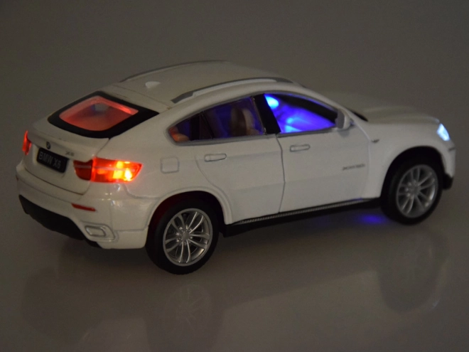 Descubre la réplica de BMW X6 meticulosamente diseñada con pintura blanca nacarada, ideal para cualquier colección de coches a escala. El modelo destaca por sus funciones: al abrir las puertas se oyen el claxon y la alarma, y al presionarlo contra la superficie se activa el arranque y el funcionamiento del motor. La sensación realista se refuerza con las luces delanteras y traseras y los instrumentos iluminados.