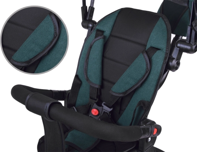 Este triciclo multifuncional 3 en 1 combina carrito, correpasillos y triciclo clásico. Gracias al asiento giratorio e inclinable, la funda suave y el arnés de 5 puntos, el viaje es cómodo y seguro para los pequeños exploradores. La capota plegable con malla de ventilación protege del sol, el viento y la llovizna.