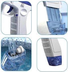 Incluye batería con cable USB y depósitos de agua. Cárgala fácilmente y vuelve a la acción.