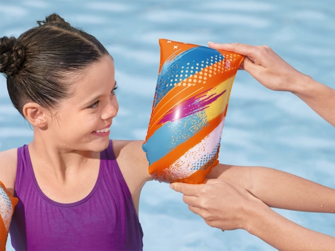 El llamativo color naranja y la gráfica veraniega con mariposas garantizan una excelente visibilidad en la piscina, en el lago y en el mar. Los manguitos son ideales para niños de 5–12 años con peso sugerido de 24–60 kg.