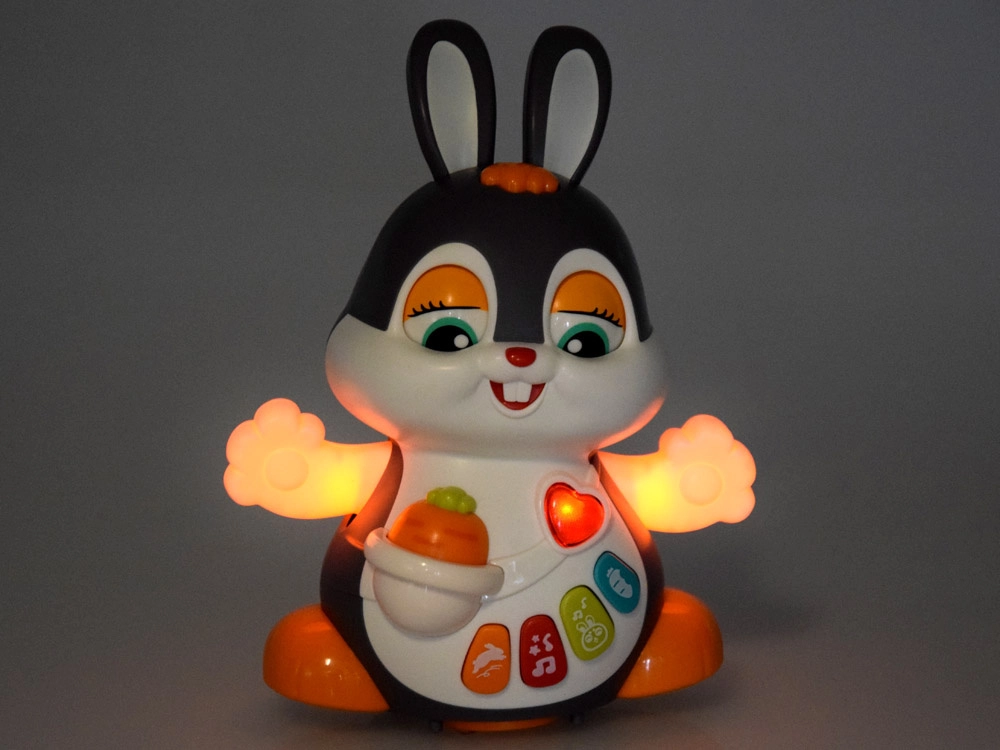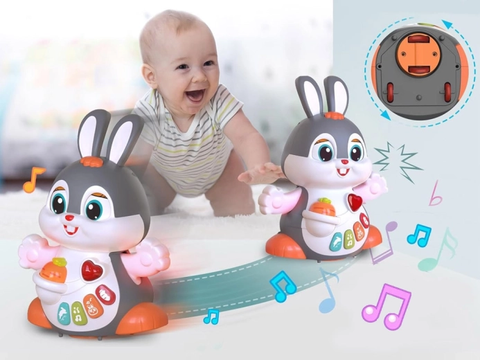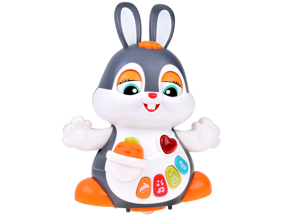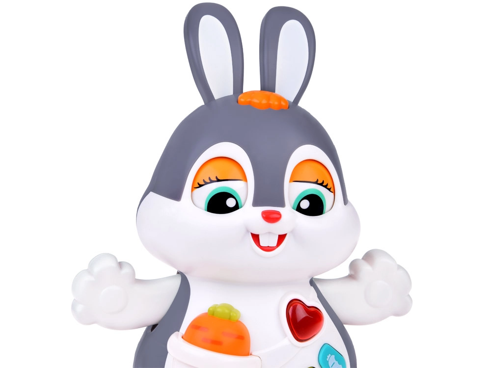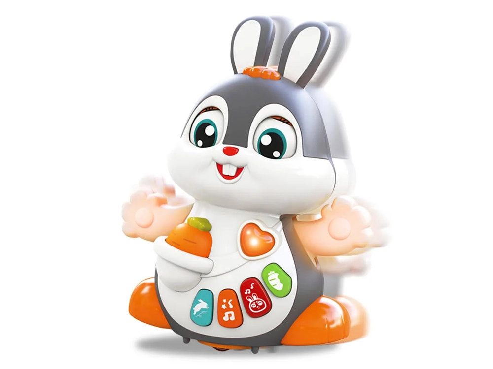 El conejito interactivo bailador es un gran compañero para los primeros pasos y el gateo. El juguete puede moverse, parpadear y brillar al ritmo de la música. Atrae a los niños con botones de colores y funciones variadas: melodías, latidos del corazón, sonidos de saltos o de morder una zanahoria, todo acompañado de efectos luminosos.