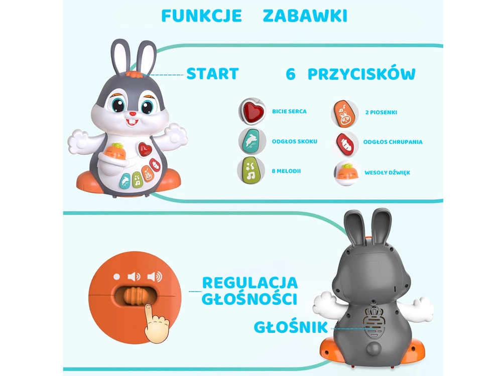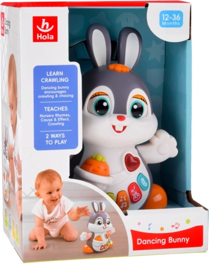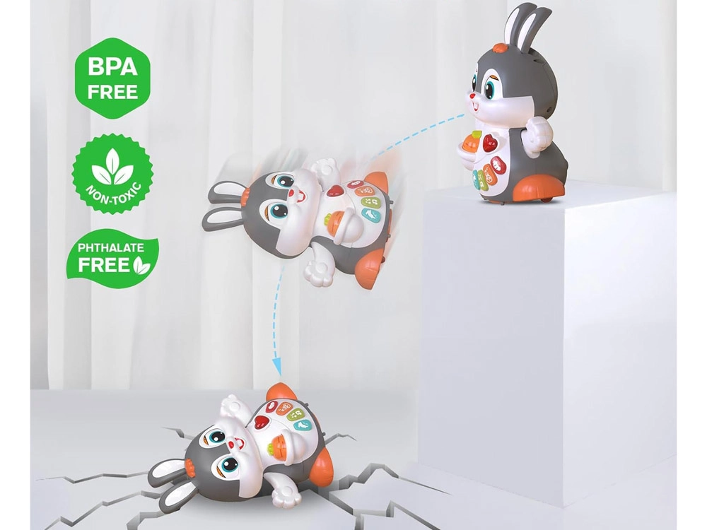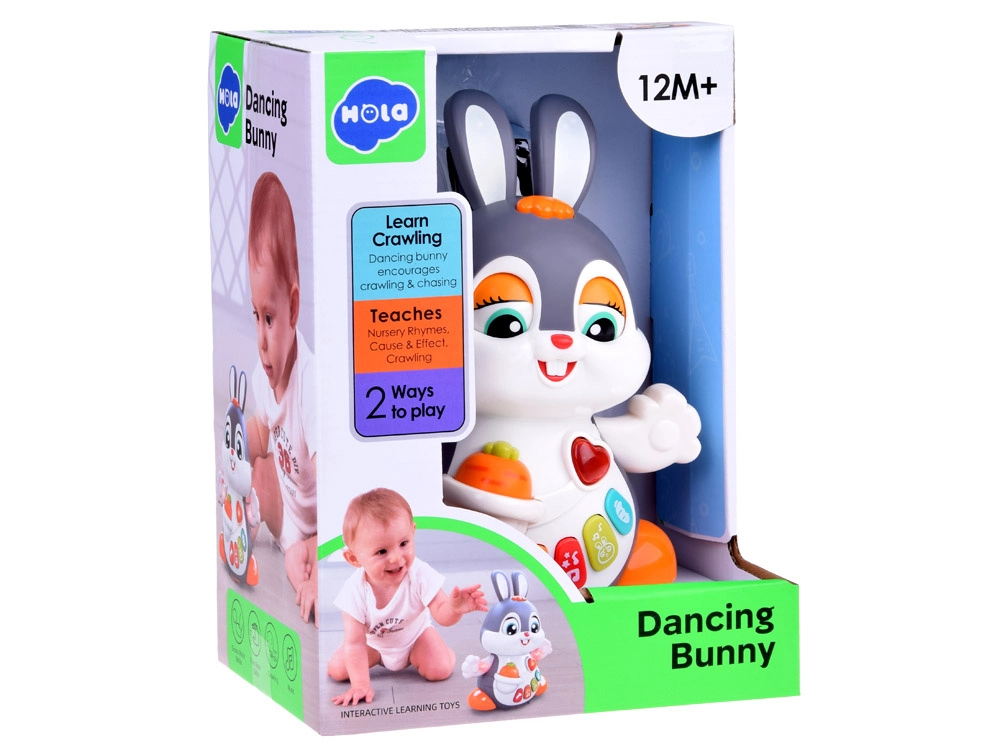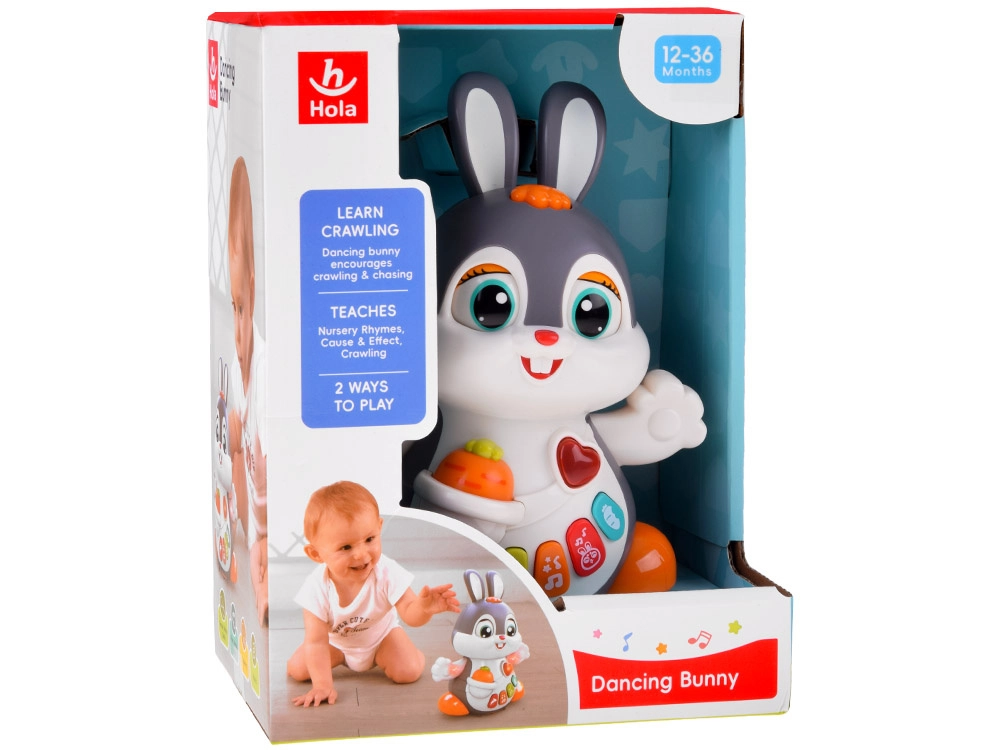 El conejito interactivo bailador es un gran compañero para los primeros pasos y el gateo. El juguete puede moverse, parpadear y brillar al ritmo de la música. Atrae a los niños con botones de colores y funciones variadas: melodías, latidos del corazón, sonidos de saltos o de morder una zanahoria, todo acompañado de efectos luminosos.