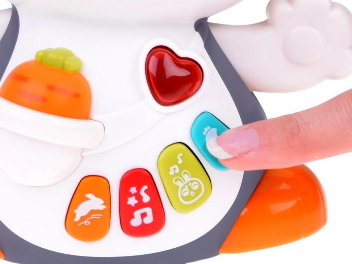 Los botones de colores activan distintas melodías y sonidos (latidos del corazón, saltitos, mordisquear zanahorias), acompañados de luces intermitentes, ideales para la estimulación sensorial.