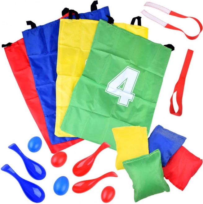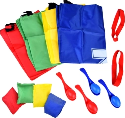 - 4 sacos para saltar (66 × 50 cm), 4 cucharas de plástico, 4 huevos de plástico, 4 saquitos para lanzar, 2 cintas para carrera en parejas