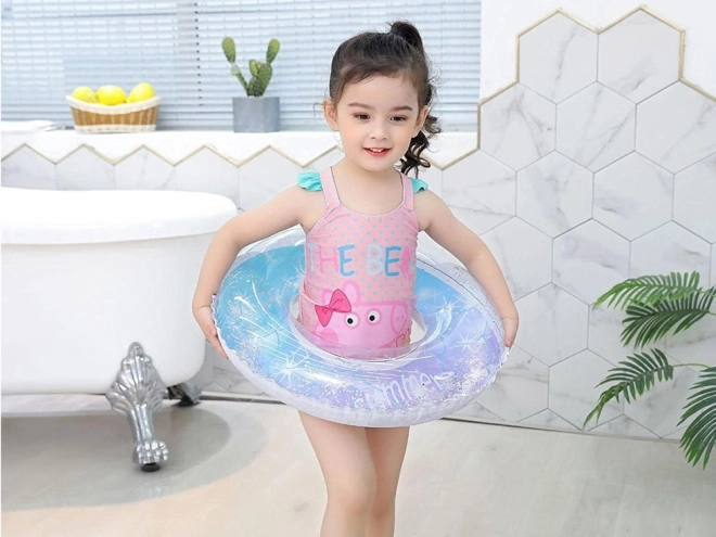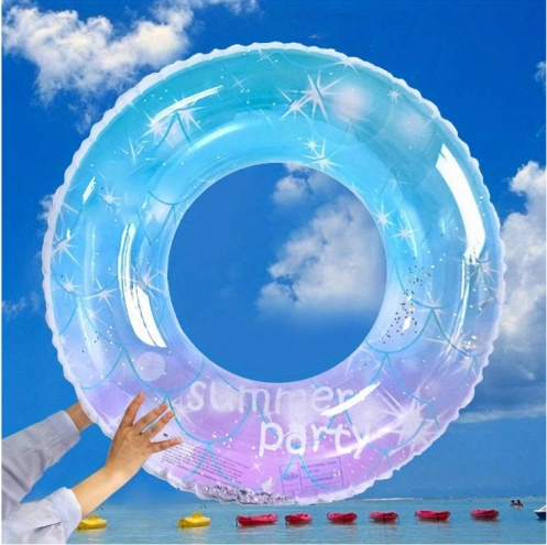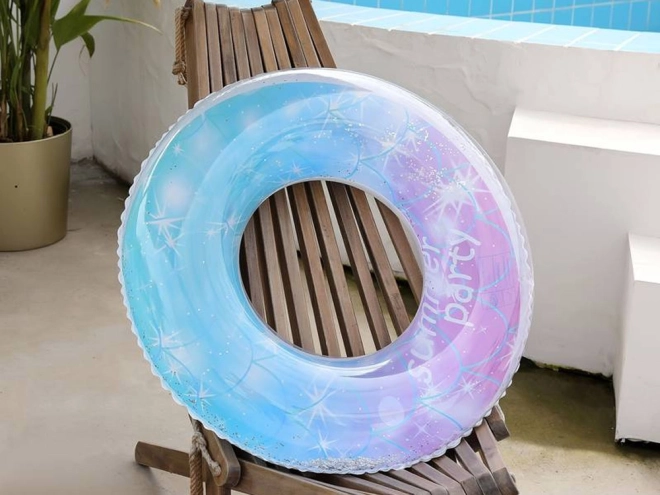 El aro transparente con degradado azul‑rosa y brillos “summer party” luce tanto en la piscina como en la playa y encantará a cualquier niño.