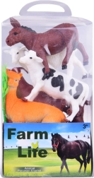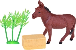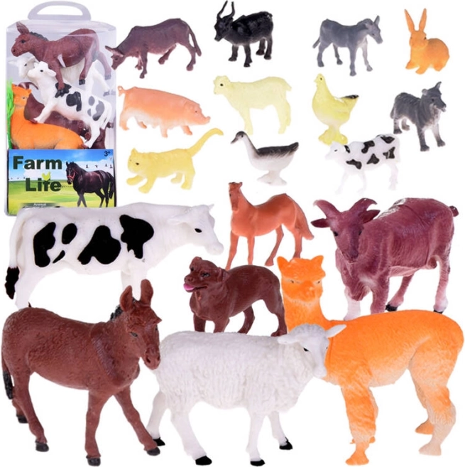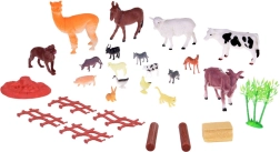 Vaca, caballo, perro, burro, oveja con cordero, cabras, alpaca, cerdo, búfalo, gato, conejo, pato y gallina, complementados con valla, fardo de heno, troncos, arbusto y base de juego.
