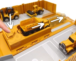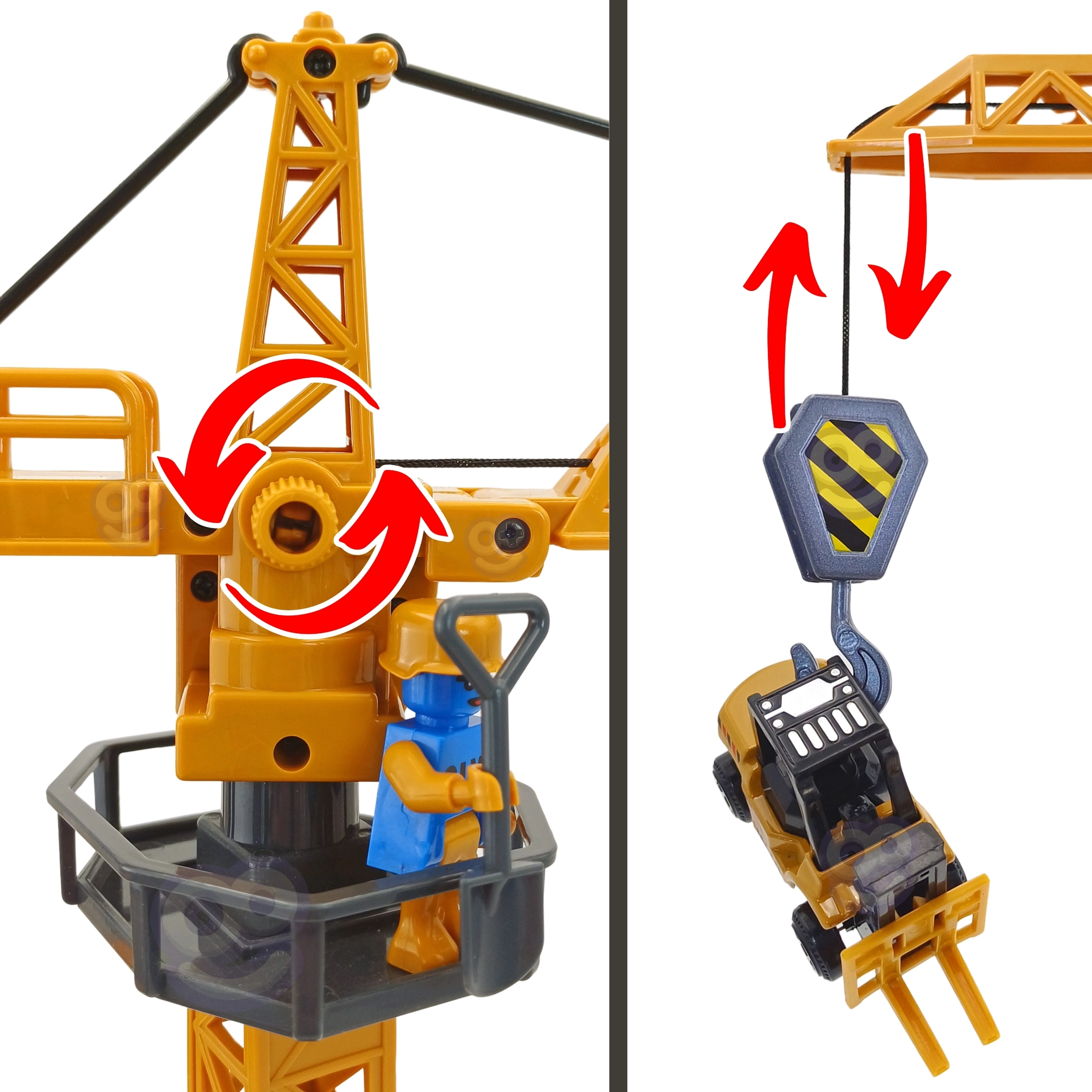 La alta grúa eleva accesorios, gira y crea una atmósfera realista de obra. Ideal para cargar contenedores y barriles.