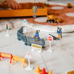 Para un juego seguro y educativo, no faltan señales de tráfico, barreras, conos y vallado, para que los niños aprendan lo básico de la seguridad vial y en la obra. El set es ideal para el juego creativo, el desarrollo de la motricidad fina y la imaginación.