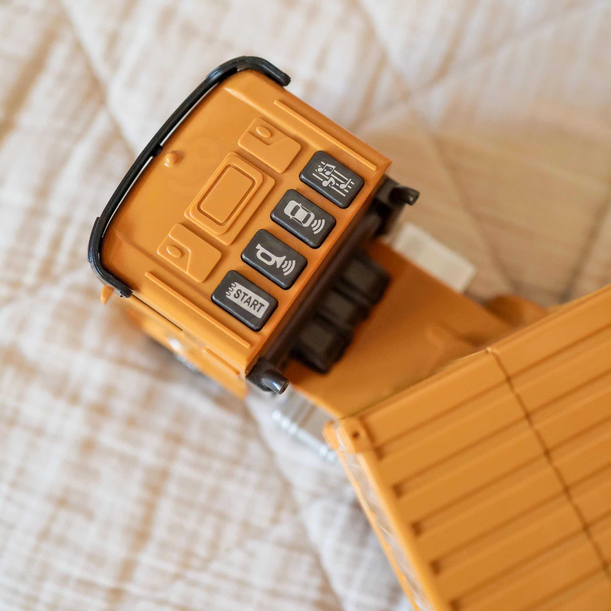 Cuatro botones activan el claxon, el sonido de marcha atrás y melodías divertidas. Las luces rojas intermitentes realzan la acción del juego.