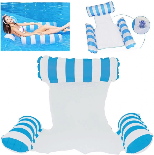 Despídete del colchón flotante común y dale la bienvenida a una solución única: una colchoneta estilo hamaca, ideal para los calurosos días de verano. Diseñada para permitir una inmersión parcial en el agua, te mantendrá agradablemente fresco mientras tomas el sol. La colchoneta cuenta con partes inflables fabricadas en PVC resistente y está unida por una malla de nailon para ofrecer el máximo confort. Su elegante diseño en azul y blanco será el toque estrella de tus fotos de vacaciones.