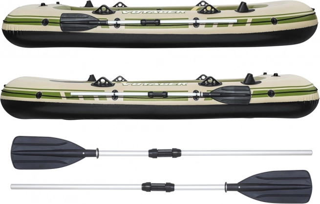 Incluye remos robustos, soportes para remos, cañas de pescar y cojines inflables en los asientos, para un confort y funcionalidad totales en el agua.