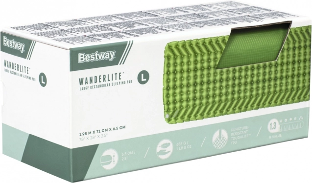 La colchoneta inflable BESTWAY WanderLite Large es una compañera fiable para acampar, hacer senderismo y festivales. Gracias a sus generosas dimensiones de 198 × 71 × 6,5 cm, encaja perfectamente incluso con sacos de dormir más grandes y ofrece un aislamiento y soporte cómodos sobre superficies irregulares. La combinación del material ToughLite y el nylon ripstop 70D aporta alta resistencia a la abrasión y al desgarro con un peso reducido.