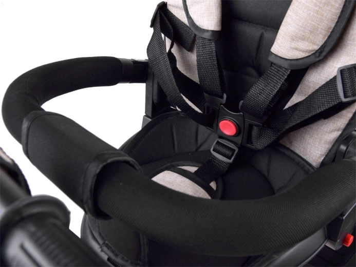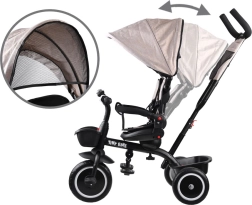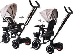 Este triciclo multifuncional 3 en 1 combina un modo de empuje con control parental, un cómodo modo tipo cochecito y un triciclo independiente para los primeros paseos. El asiento giratorio permite mirar a los padres o en el sentido de la marcha; la capota con malla de ventilación protege del sol, viento y lluvia ligera, garantizando un clima agradable. El arnés de 5 puntos, la barra acolchada desmontable y la funda acolchada de fácil mantenimiento ofrecen comodidad y seguridad.