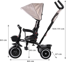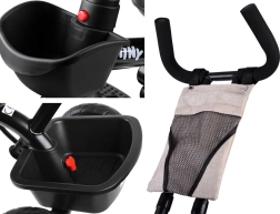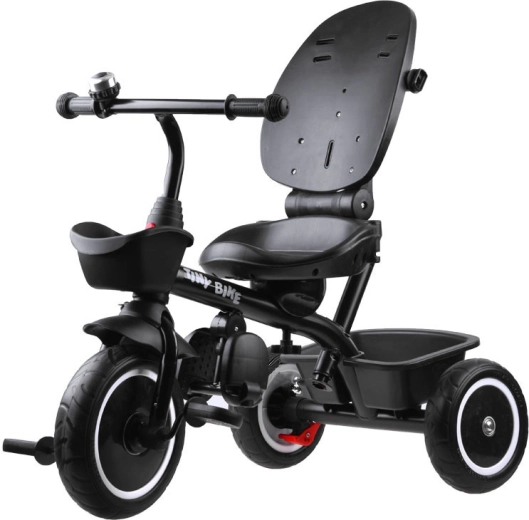 Los padres apreciarán la barra de empuje ajustable con agarre cómodo, los frenos de estacionamiento dobles en las ruedas traseras y los prácticos espacios de almacenamiento: cestita delantera, cesta trasera grande y bolsa pequeña para objetos personales. Las ruedas de espuma EVA no requieren inflado y brindan una marcha silenciosa y estable. Los reposapiés abatibles y los pedales en la rueda delantera facilitan la transición entre modos, de modo que el triciclo crece sin problemas con el niño.