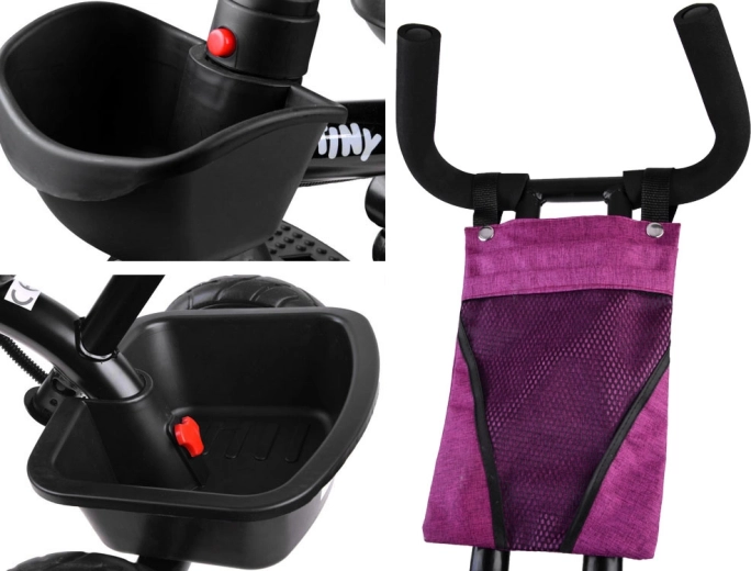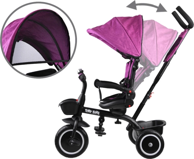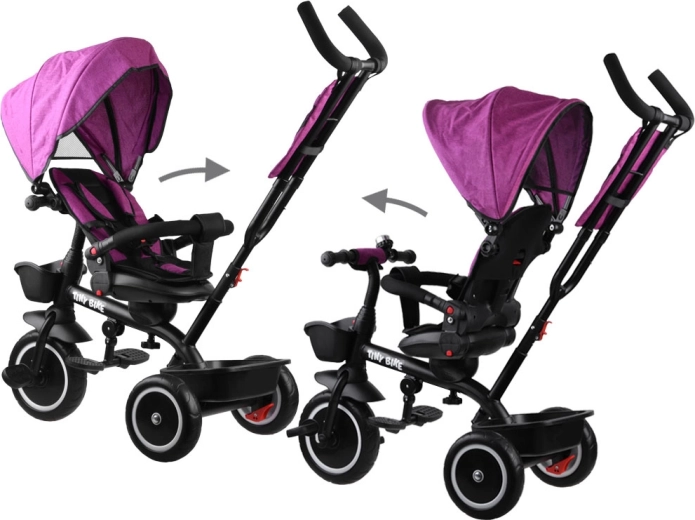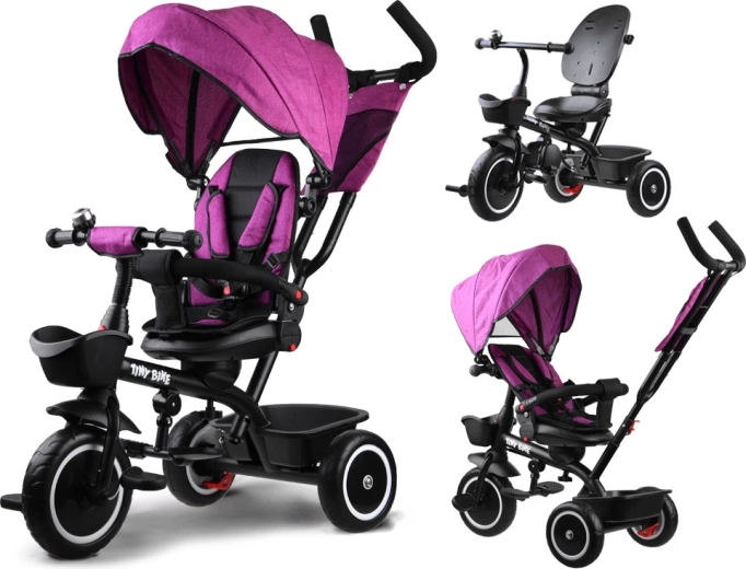 Práctico triciclo infantil 3 en 1 TINY BIKE con asiento giratorio y capota que crece con tu hijo desde los 6 meses hasta los 5 años. Ofrece comodidad, arnés de 5 puntos, capota plegable con malla, dirección parental y ruedas EVA sin mantenimiento para paseos seguros y fluidos.