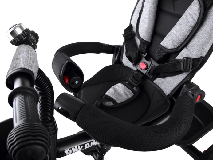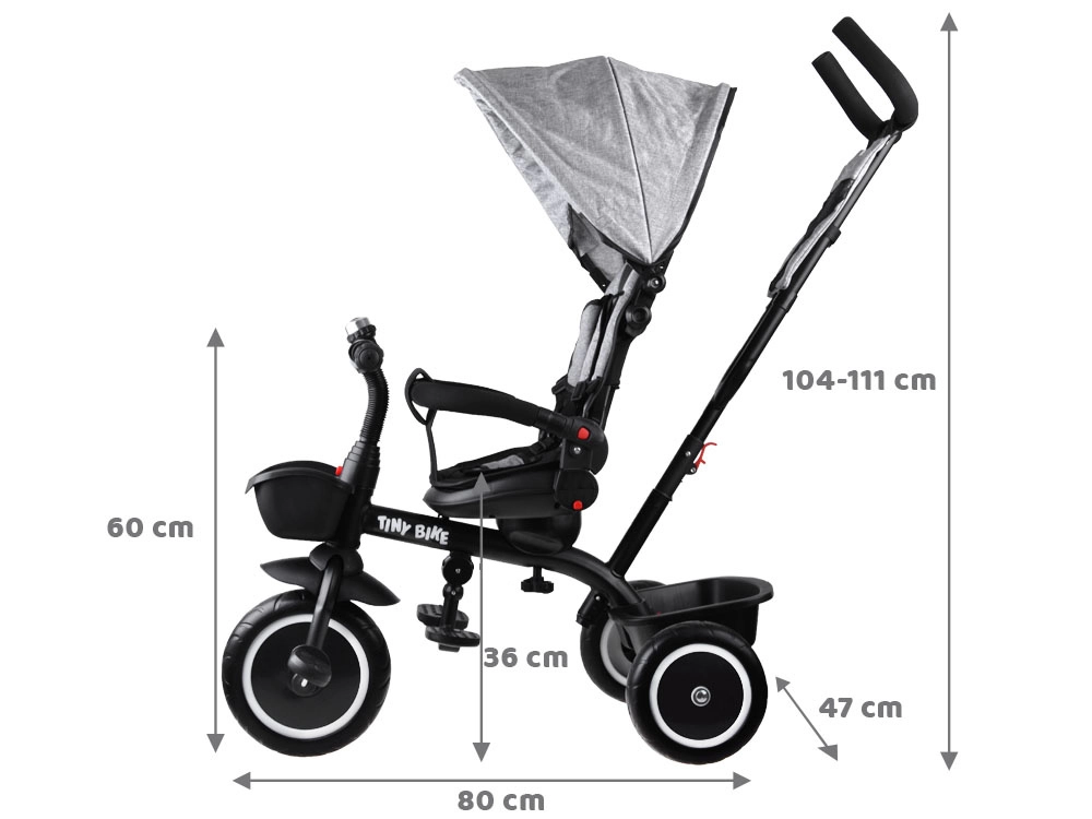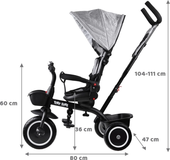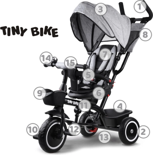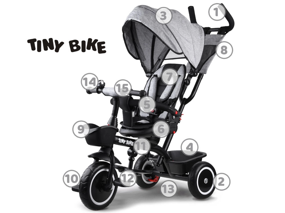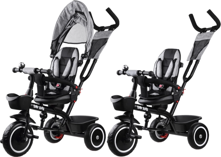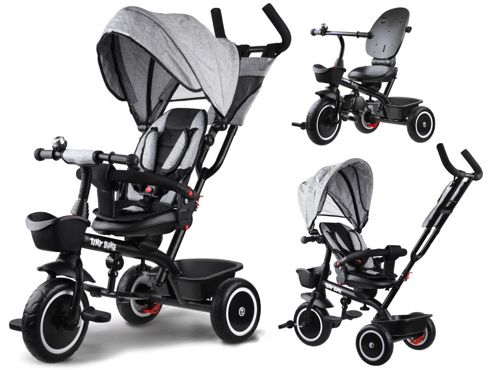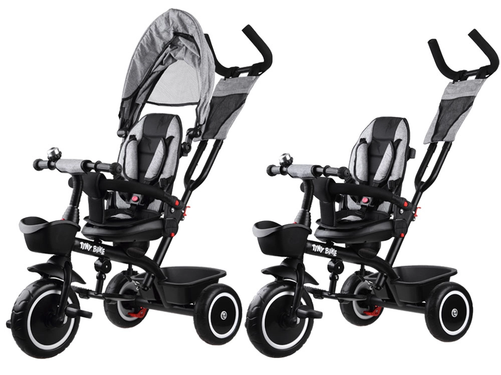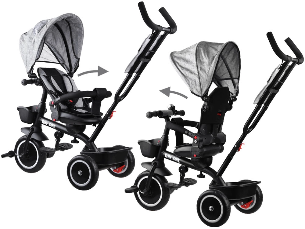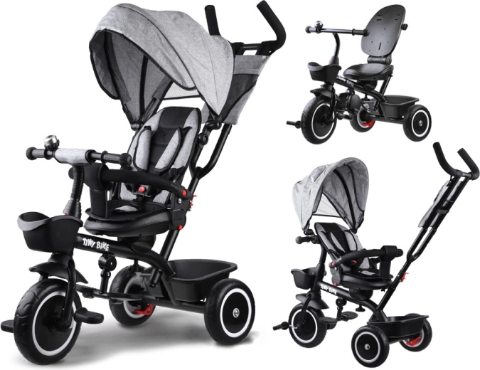 El triciclo infantil multifuncional 3 en 1 TINY BIKE con asiento giratorio combina las funciones de triciclo de empuje, cochecito y bicicleta de pedales independiente. Ofrece arnés de 5 puntos, capota plegable con malla, ruedas EVA sin mantenimiento, frenos traseros y abundantes accesorios para paseos cómodos y seguros desde los 6 meses hasta aprox. 5 años.