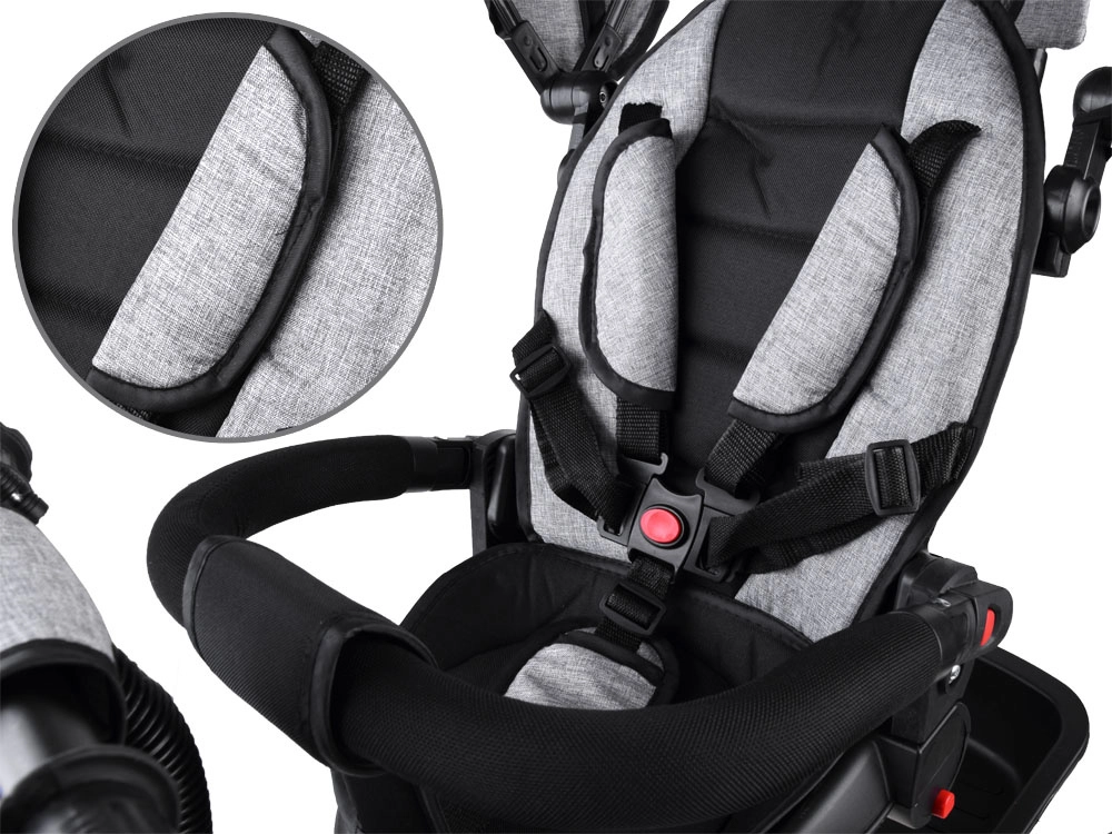 El triciclo 3 en 1 crece con el niño: desde el modo con dirección parental, pasando por los primeros pedaleos, hasta la conducción independiente. El asiento giratorio y reclinable con funda suave, el arnés de 5 puntos y la barra de seguridad acolchada proporcionan máxima seguridad y confort. La capota plegable con malla trasera ventila y protege del sol, el viento y la llovizna.