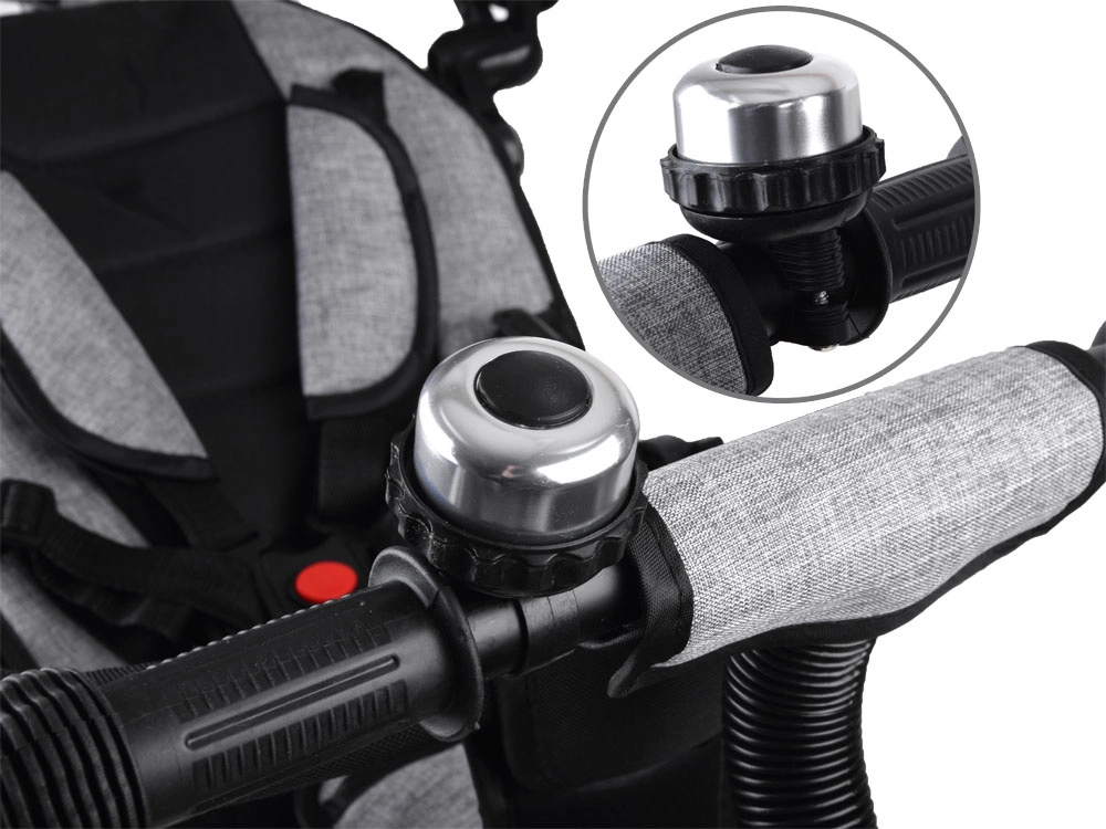 El timbre metálico para alertar con seguridad y los agarres de espuma en la barra de empuje facilitan a los padres guiar el triciclo en entornos concurridos.