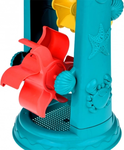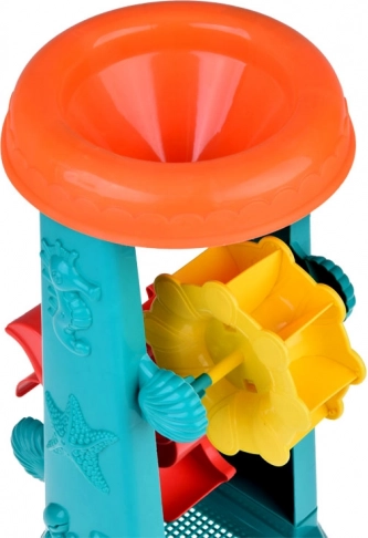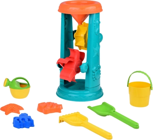 El set infantil para arena está cuidadosamente diseñado con motivos de animales marinos como pececitos y pulpos. La mayor atracción es la rueda de agua de 37 centímetros, en la que los niños pueden verter arena o agua y observar cómo giran las ruedas dobles. Esto fomenta el desarrollo del pensamiento lógico y la comprensión de las relaciones de causa y efecto.