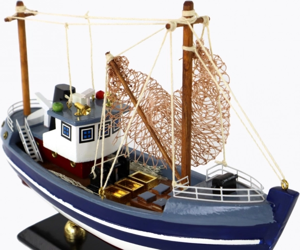 El modelo destaca por sus altos mástiles, la red de pesca tensada en la cubierta, y una cabina equipada con bocinas y luces de señalización. En la proa hay un decorativo timón que evoca la rica tradición de la navegación. Una gran elección como decoración de interior con estilo para el salón, la oficina o estanterías de colección.