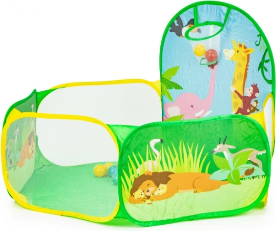 El paquete incluye 50 pelotas de plástico (Ø 6 cm), que convierten la tienda en una divertida piscina de bolas seca. El aro para encestar integrado motiva al movimiento y desarrolla la coordinación y la precisión. El suelo resistente está preparado para jugar tanto en interiores como en exteriores.