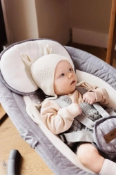 Arnés de cinco puntos, cojín suave y funda aterciopelada para mayor confort. La capota con mosquitera protege durante el uso en la terraza o el jardín.