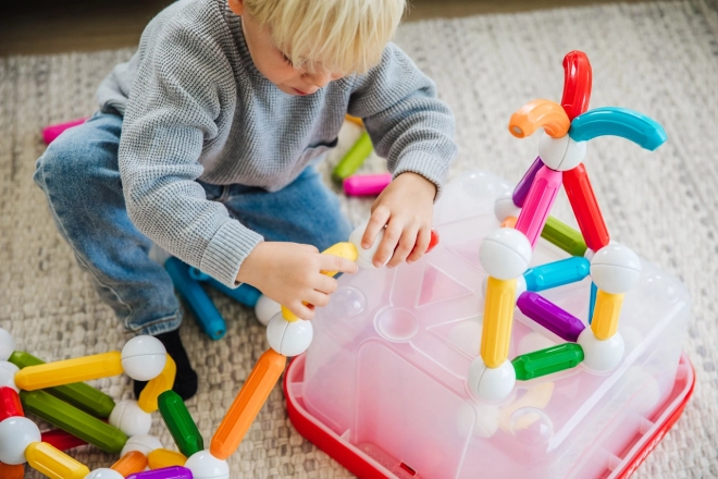 Descubre el gran set SMARTMAX para pequeños constructores: contenedor con 100 piezas magnéticas para crear grandes edificaciones, puentes y estructuras. Apto desde 1 año, ideal para juego en casa, guarderías y zonas infantiles. Práctico contenedor con tapa roja y base que funcionan como placas de construcción para facilitar el guardado y el montaje. Construcción magnética segura que cumple con las normas ASTM F963 y EN71.