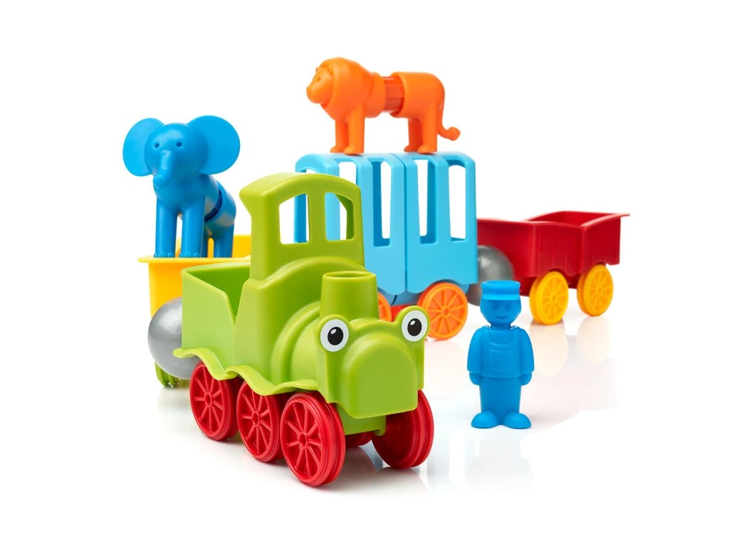 Este colorido juego de construcción magnético permite a los niños acoplar vagones a la locomotora, cargar los animales y emprender un viaje lleno de aventuras. Todas las piezas están hechas de plástico suave, resistente y seguro, diseñado para las manos pequeñas. El conjunto se mantiene firmemente unido gracias a los potentes imanes SmartMax, que cumplen estrictas normas de seguridad.