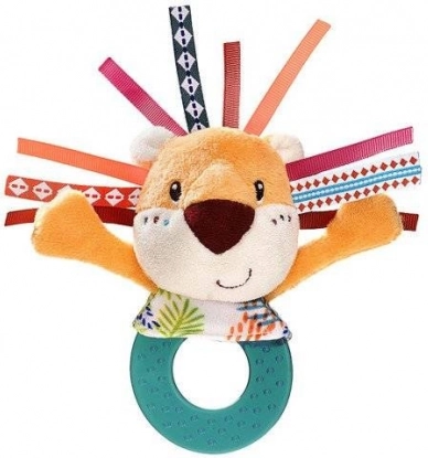 El sonajero está hecho de suave felpa y complementado con alegres cintas de colores que forman la melena, estimulando los sentidos visuales y táctiles.