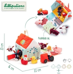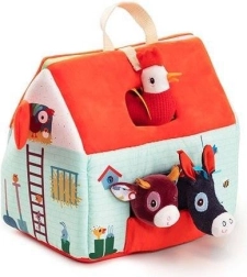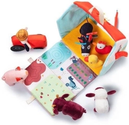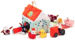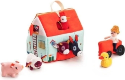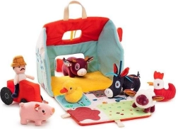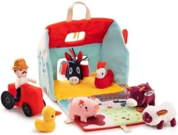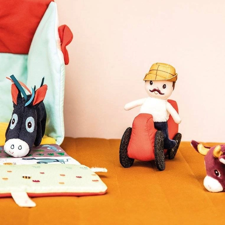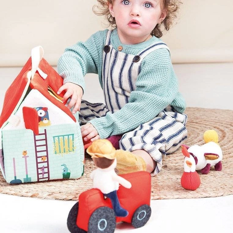 Este set textil convierte cada día en una aventura en la granja. La colorida casita-granero se despliega formando un corral campestre con estampados de parterres, prado, estanque y un lodazal para el cerdito. Incluye al granjero barbudo Jeff, un tractor rojo y los animalitos: la vaquita Rosalie, el cerdito Simon, la ovejita Yvon, el pato Gaston, la gallina Paulette y el burrito Ignace. Todo está fabricado con materiales suaves y distintas estructuras para la estimulación sensorial.