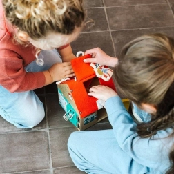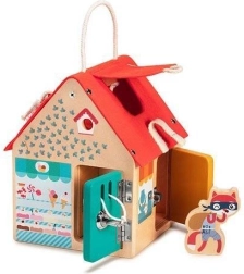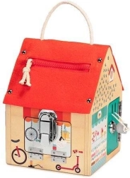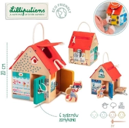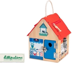 Esta casita de alta calidad de la marca belga LILLIPUTIENS ofrece una actividad diferente en cada lado y en el techo. Los niños abrirán y cerrarán puertecitas de distintas “tienditas” (bicicletas, pastelería, joyería, comestibles) y explorarán 6 tipos de cierres: llave, pasador deslizante, pestillo, gancho, cremallera y velcro. El techo textil es resistente y está fijado con broches; la casita también cuenta con un asa de cuerda para transportarla fácilmente.