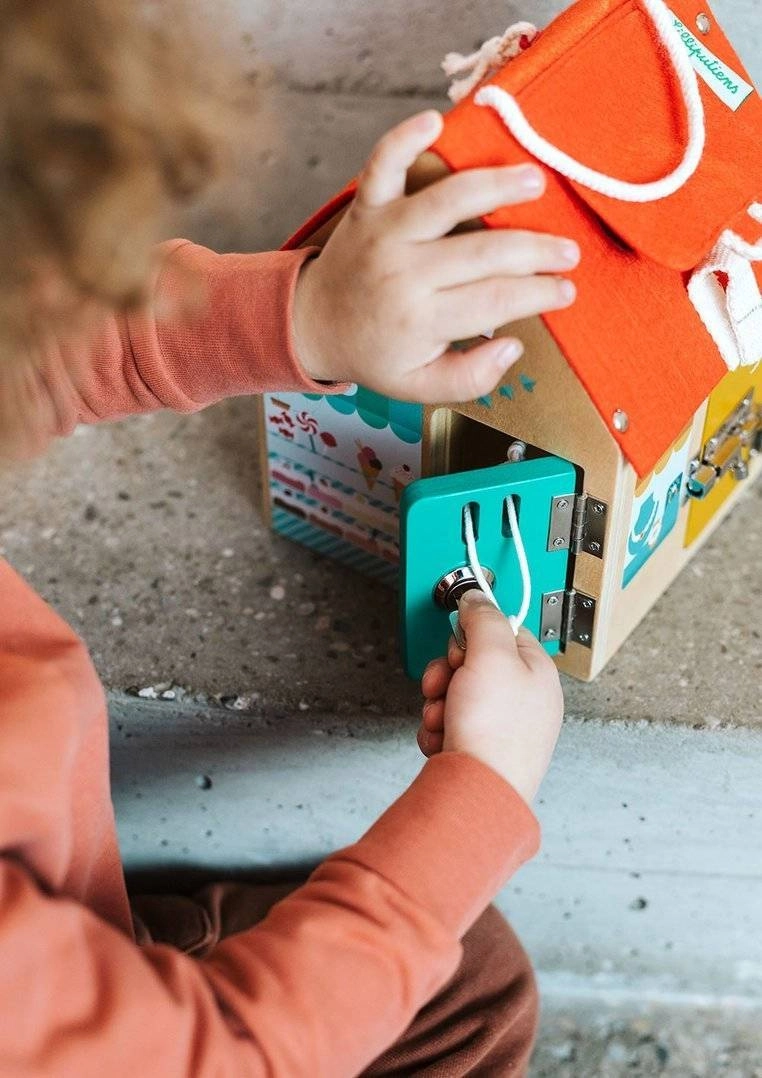 Llave, pasador, pestillo, gancho, cremallera y velcro: cada mecanismo enseña habilidades distintas y fortalece la motricidad fina.