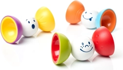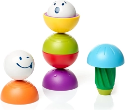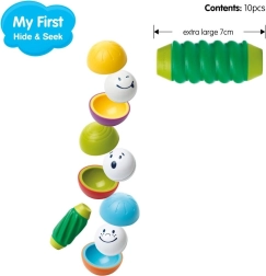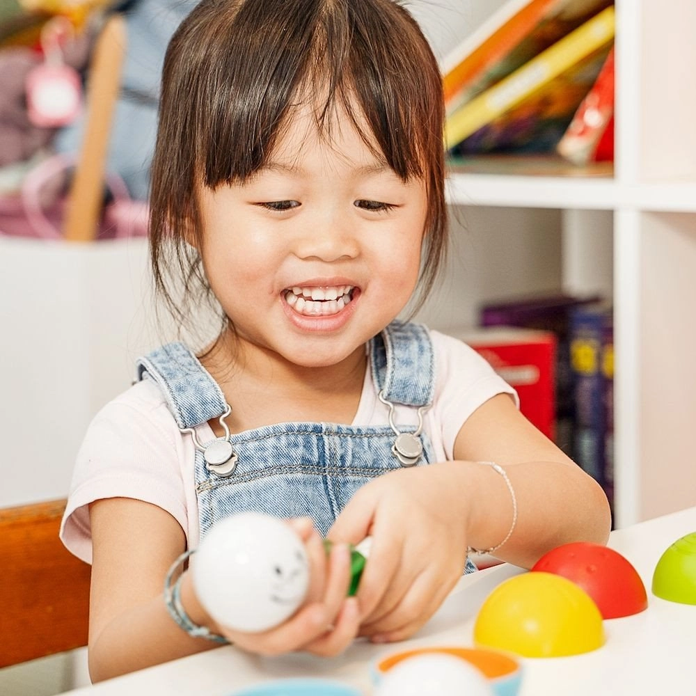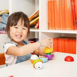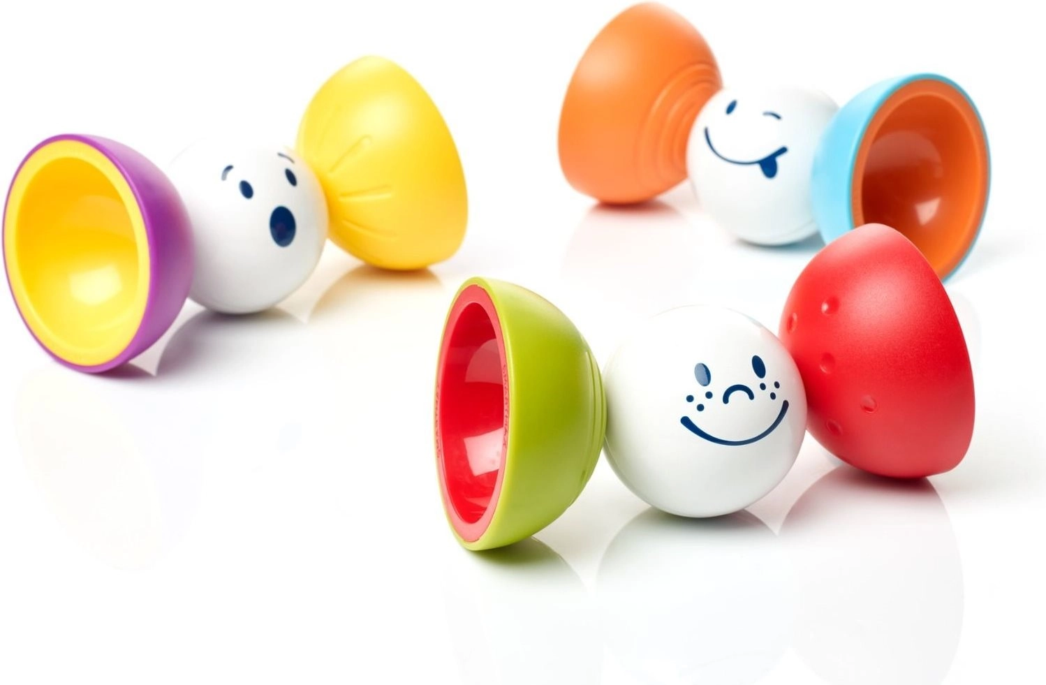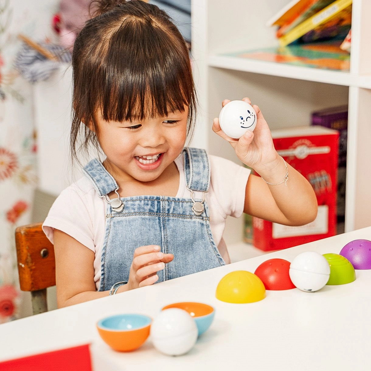 Las caras alegres y los colores vivos motivan a los niños a construir, clasificar y jugar al escondite con las bolitas.