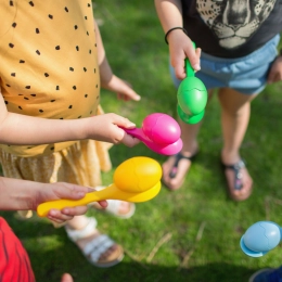 La carrera de huevos es un juego de movimiento sencillo y adictivo para niños y adultos. Los jugadores llevan un “huevo” de colores en su cáscara sobre una cuchara de plástico e intentan completar el recorrido sin que se caiga. Una opción excelente para fiestas infantiles, guarderías, campamentos y tardes en familia al aire libre o en el gimnasio.