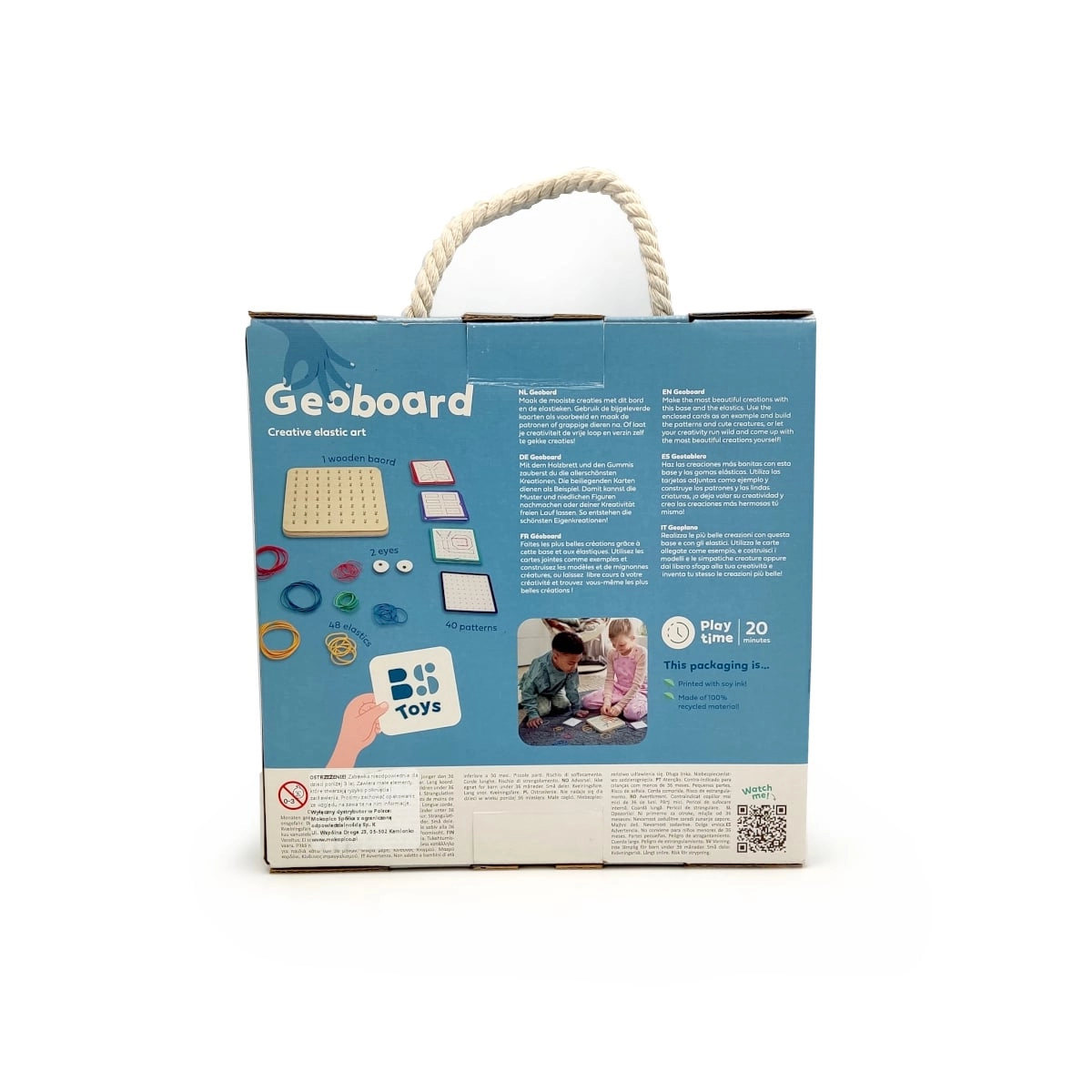 El set incluye una tabla de madera de 18 x 18 x 1,5 cm, 48 gomas de colores y 20 tarjetas de doble cara con tareas, que proporcionan inspiración y también la posibilidad de crear proyectos propios y únicos.