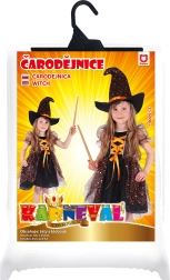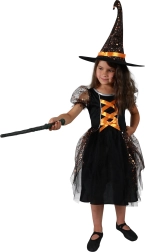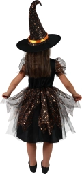 El vestido está ricamente decorado con elementos naranjas y estrellas metálicas que llaman la atención a primera vista. El disfraz también incluye un sombrero de bruja, lo que aporta un aspecto auténtico a todo el conjunto.