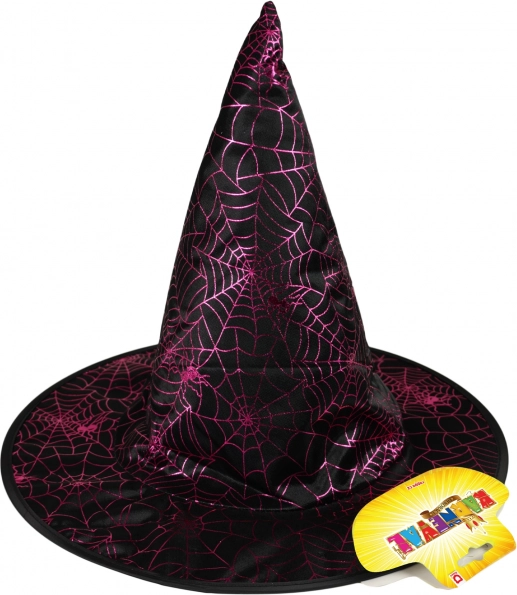 El sombrero es de color negro con telarañas moradas y llamativas, lo que lo convierte en el accesorio ideal para cualquier disfraz aterrador.