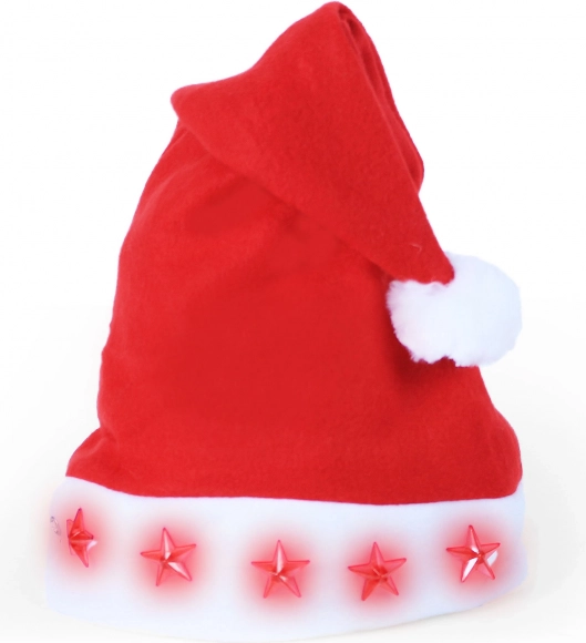 Ilumina el ambiente festivo con este elegante gorro navideño de fieltro que luce estrellitas intermitentes en la parte frontal. Con solo pulsar un botón activarás los efectos de luz: una opción perfecta para fiestas navideñas, reuniones familiares y fotos temáticas. Incluye 2 pilas LR44 para usar de inmediato.
