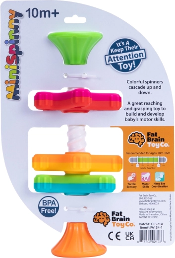 Gracias a la ventosa, el juguete se fija fácilmente a una mesa, a la bandeja de la trona o a una ventana: nada se pierde y las piezas se mantienen unidas. MiniSpinny es ideal para casa, de viaje e incluso para el baño. El plástico seguro, sin BPA ni ftalatos, garantiza un juego sin preocupaciones.