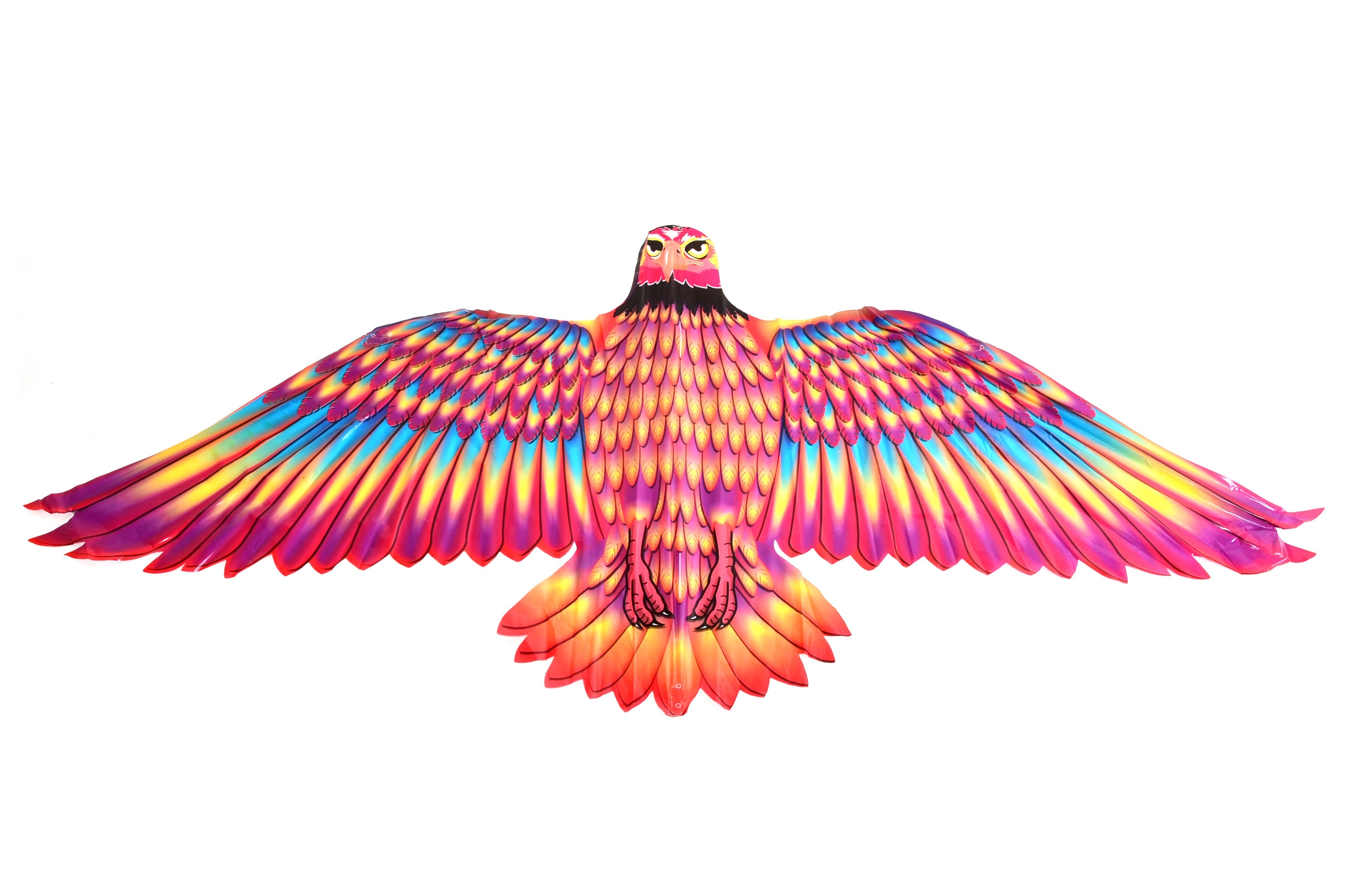 Versiones en rosa, amarillo y morado con impresión detallada de plumas que hacen que la cometa sea visible desde larga distancia y luzca espectacular en el cielo.