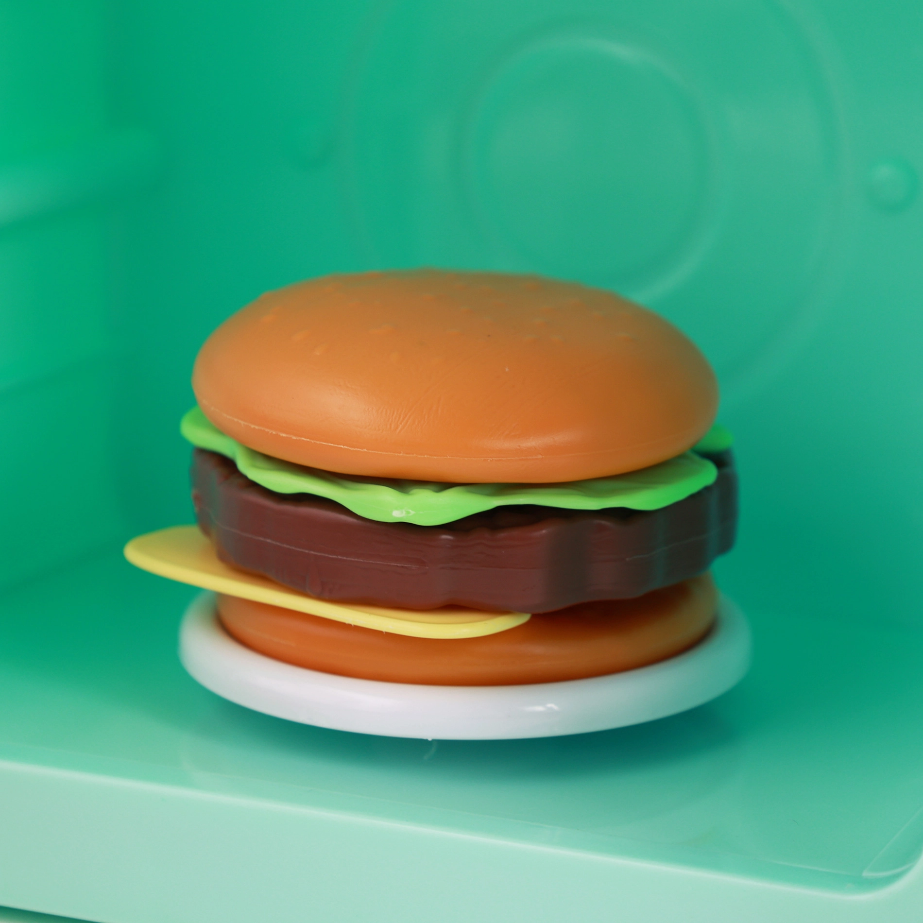 El juguete está fabricado con PVC de alta calidad e incluye tres accesorios de comida (hamburguesa, pollo, pizza) que favorecen el desarrollo de la imaginación, la motricidad fina y el juego de roles. Funciona con 3× pilas AA (no incluidas). Su tamaño compacto, de aproximadamente 26,5 × 17 × 17 cm, encaja en cualquier cocinita infantil.