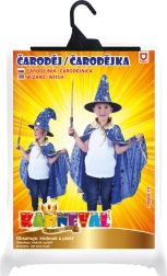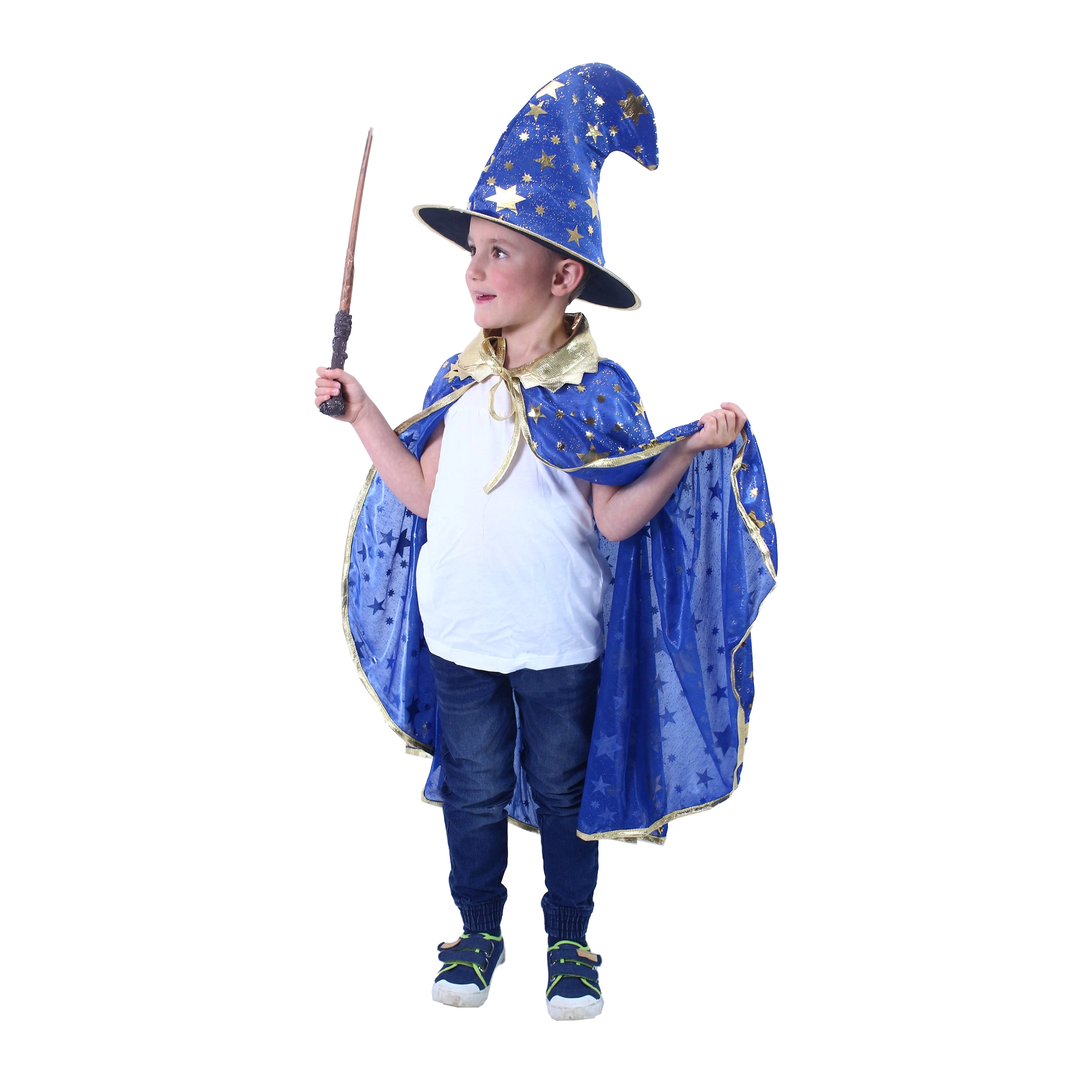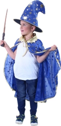 ¡Este exclusivo set de brujo garantiza que no pasarás desapercibido en ningún evento! La capa azul está decorada con ribete dorado y estrellas, que aportan un gran efecto. El sombrero combina a la perfección con la capa y completa el look. Ideal para celebraciones de Halloween o cualquier carnaval temático.